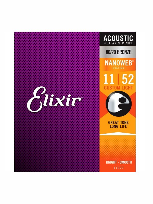 Elixir 11027 Nanoweb Coated 80/20 Bronze Acoustic Guitar Strings Custom Light (gauge 11-52), deliver the bright, lively tone and feel of traditional 80/20 bronze strings.