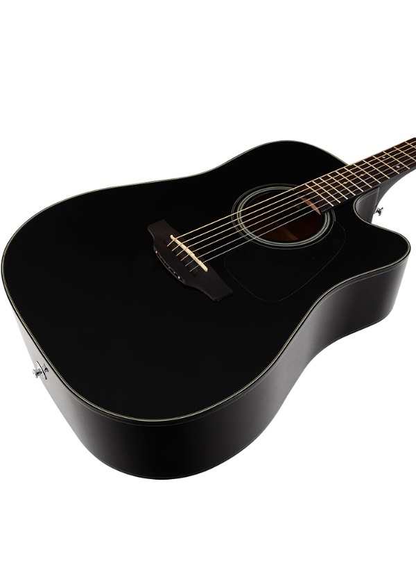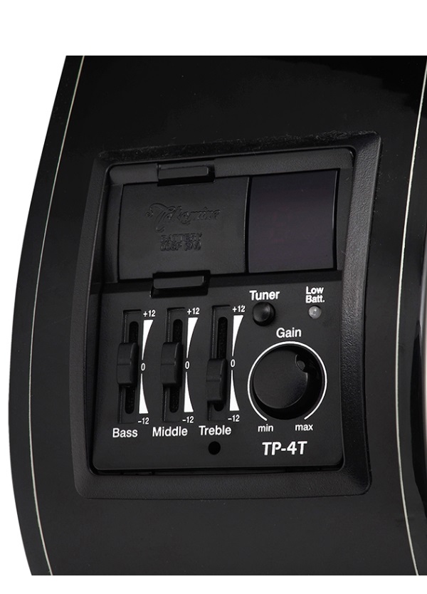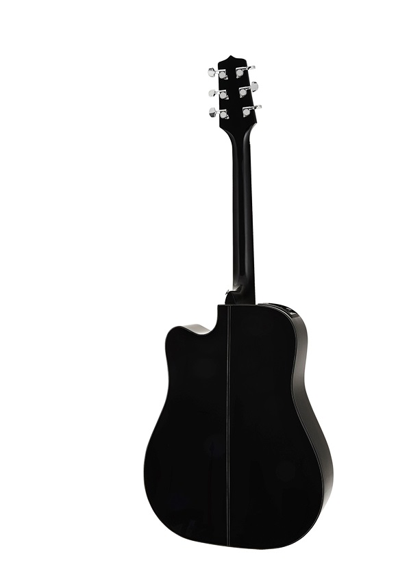 Chitarra acustica stile dreadnought spalla mancante, tavola armonica in abete, fondo e fasce in mogano, tastiera in palissandro, ponte pinless in palissandro, capotasto e selletta in osso sintetico, hardware cromato, preamplificatore tp4t con accordatore integrato, finitura nera, corde d’addario exp16 (.12-053).