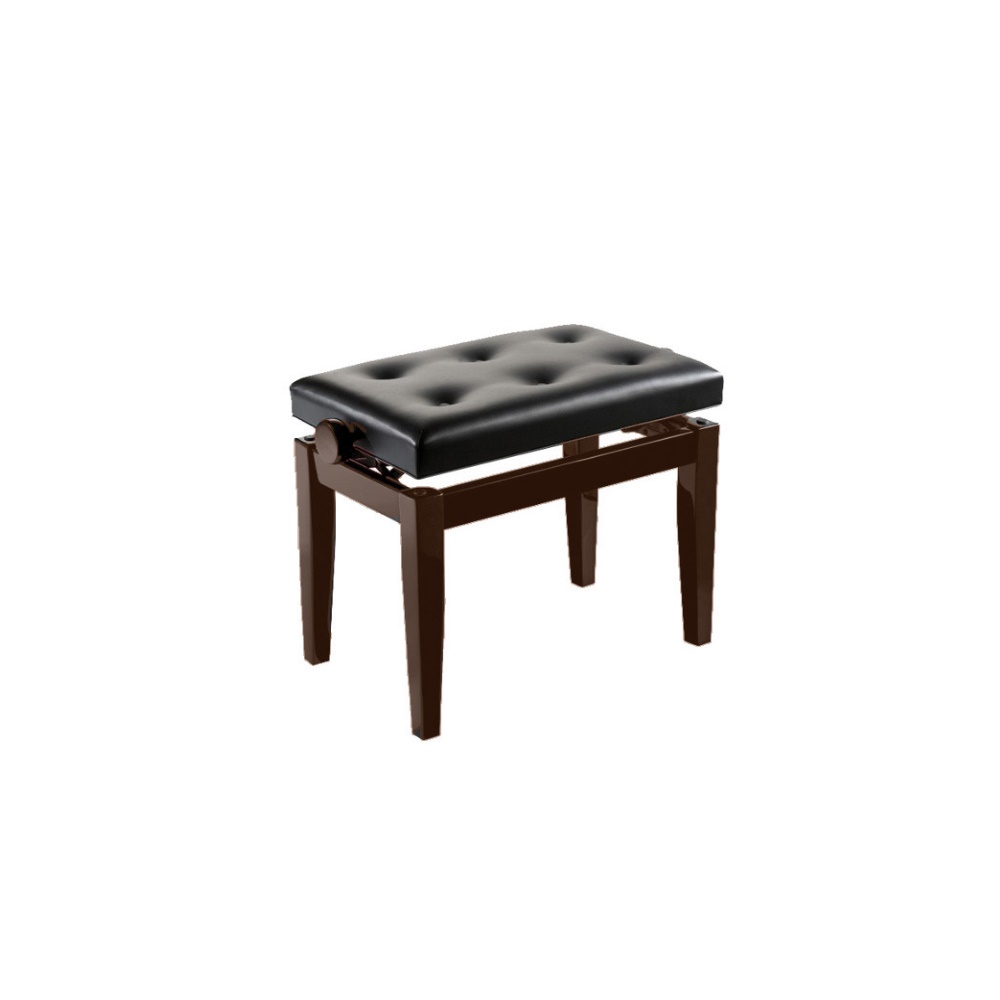 Panca per pianoforte in legno regolabile in altezza. Seduta rivestita in materiale sintetico nero.